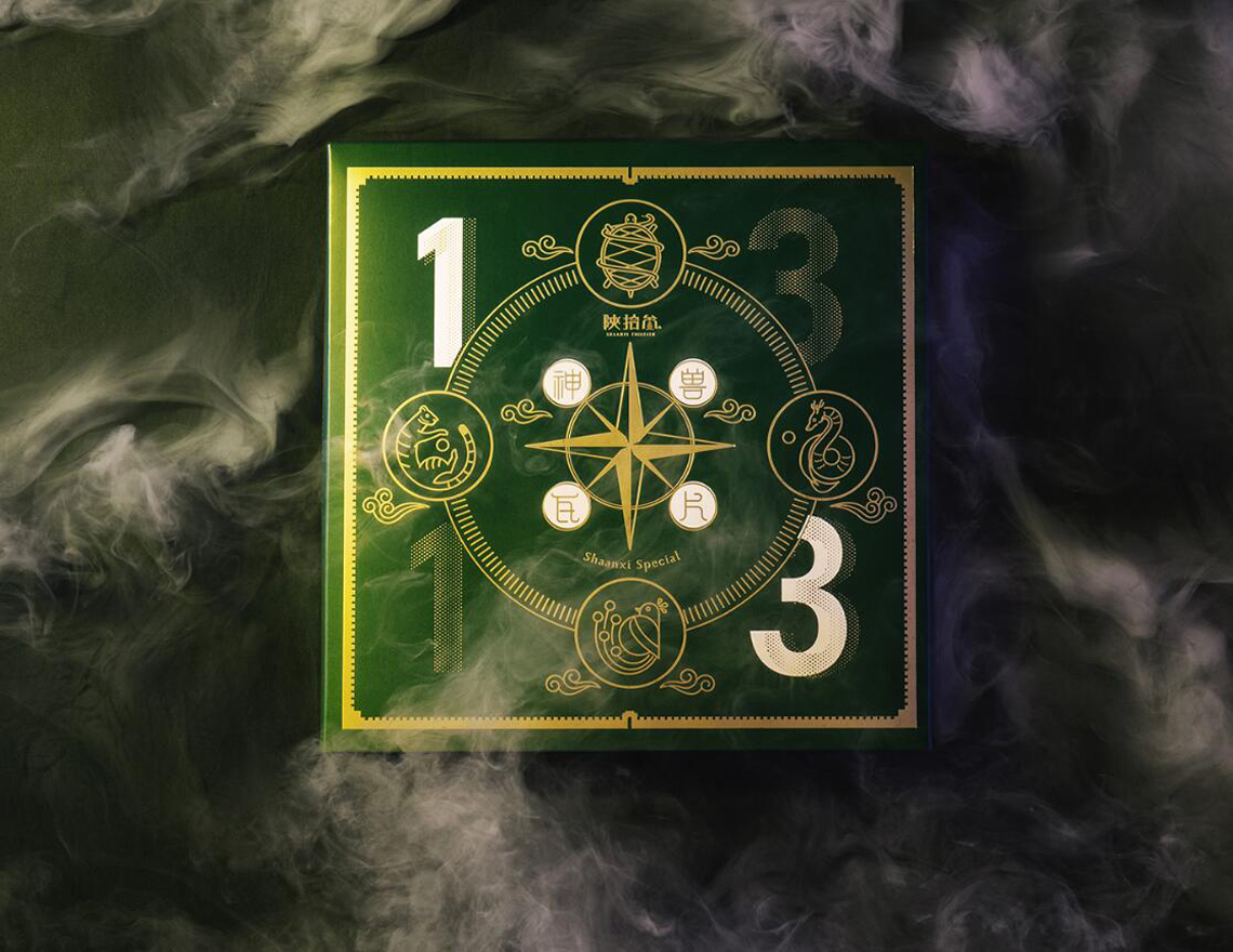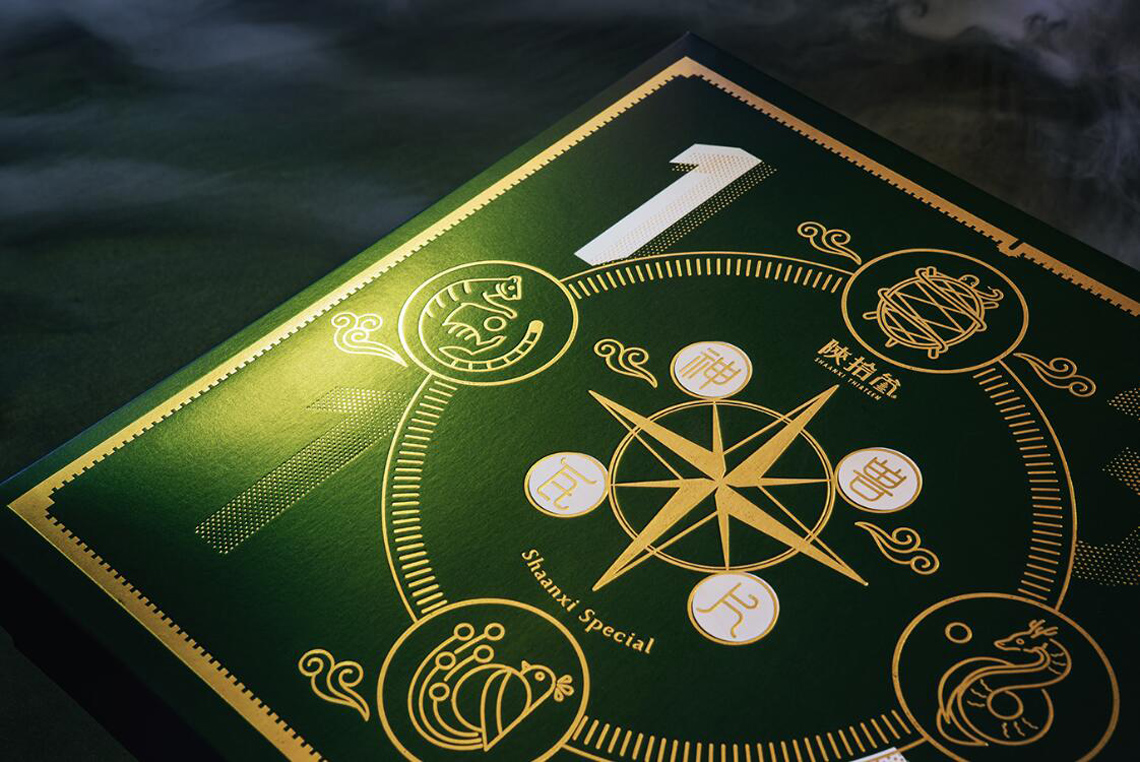 在包裝盒的設計上,使用象徵繁榮與財富的綠色結合上標示著四方神獸的羅盤燙金,
