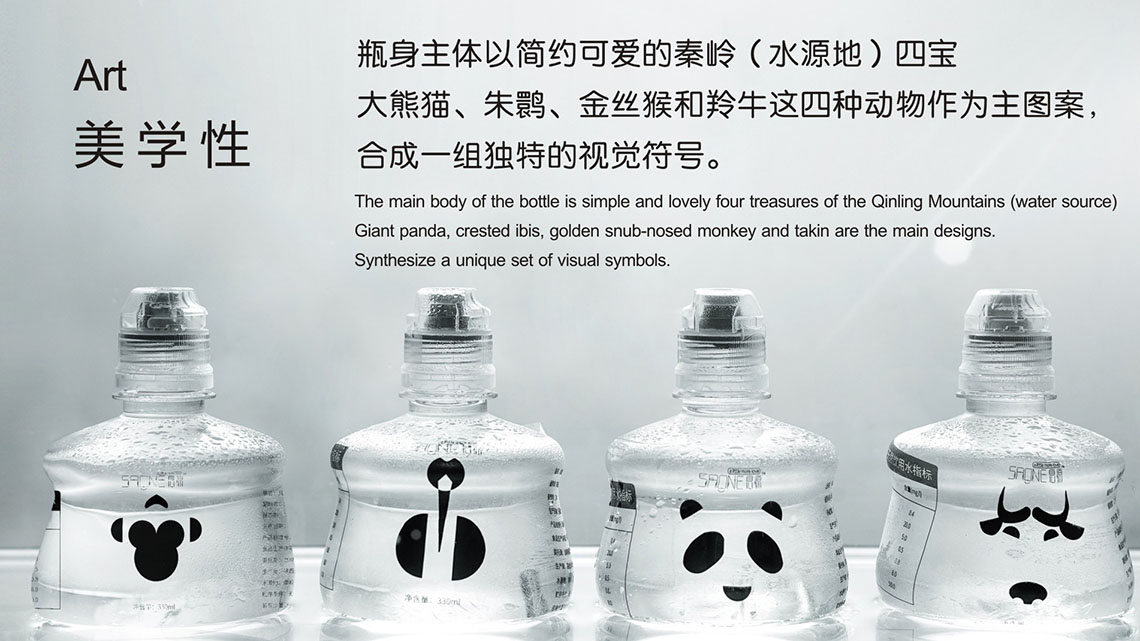 同時瓶身主體以簡約可愛的“秦嶺(水源地)四寶”——大熊貓、朱鹮、金絲猴和羚牛這四種動物作為主圖案,