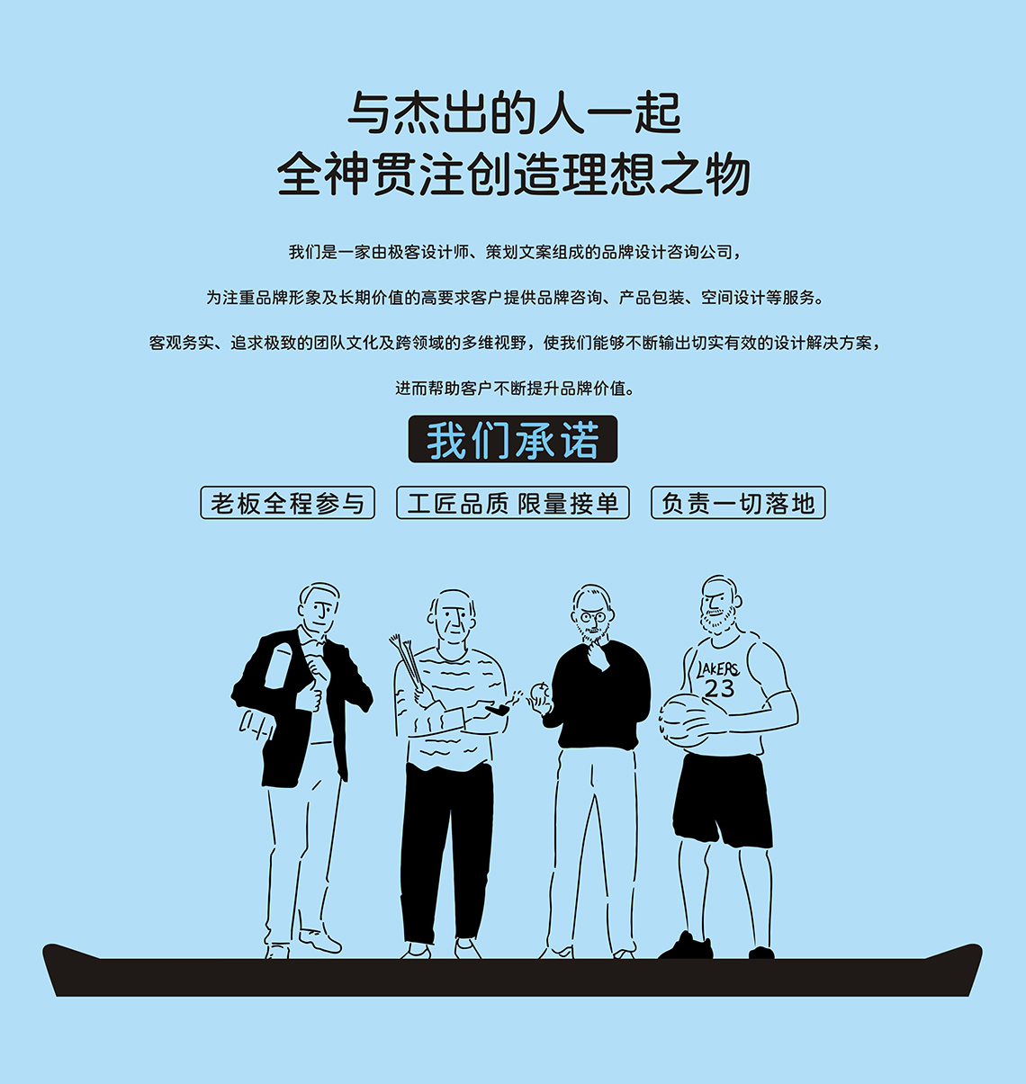 我們是一家由極客設(shè)計師、策劃文案組成的品牌設(shè)計咨詢公司,為注重品牌形象及長期價值的高要求客戶提供品牌咨詢、產(chǎn)品包裝、空間設(shè)計等服務(wù)??陀^務(wù)實、追求極致的團隊文化及跨領(lǐng)域的多維視野,使我們能夠不斷輸出切實有效的設(shè)計解決方案,進而幫助客戶不斷提升品牌價值。